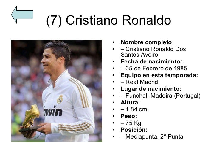 Cristiano ronaldo dos santos aveiro, couramment appelé ronaldo ou cristiano ronaldo et surnommé cr7, né le 5 février 1985 à funchal, est un footballeur international portugais qui évolue au poste d'attaquant à manchester united. Apodado con el numerónimo 'cr7', cristiano ronaldo es en realidad cristiano ronaldo dos santos aveiro. Sin duda, el primogénito del máximo.